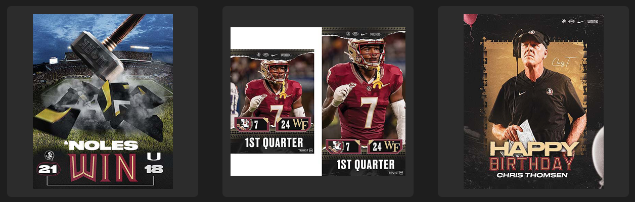 During my time as FSu Football Digital Media Intern, I was able to produce graphics for the media guide, social media, recruits, and more. Additionally, I took and edited high-quality images for the players.